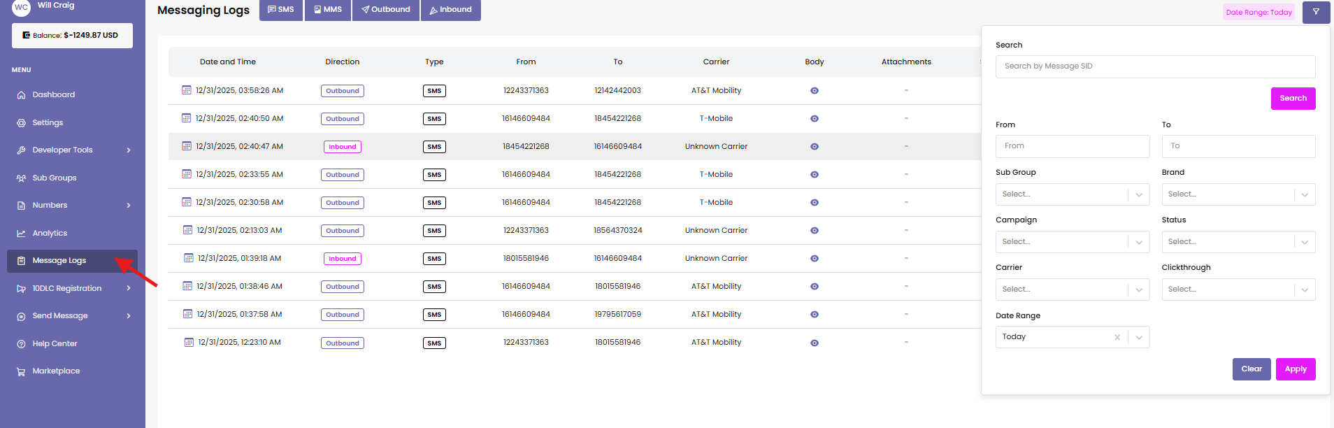 To access your message logs, click on “Message Logs” from the left-hand navigation panel of your Signal House dashboard.