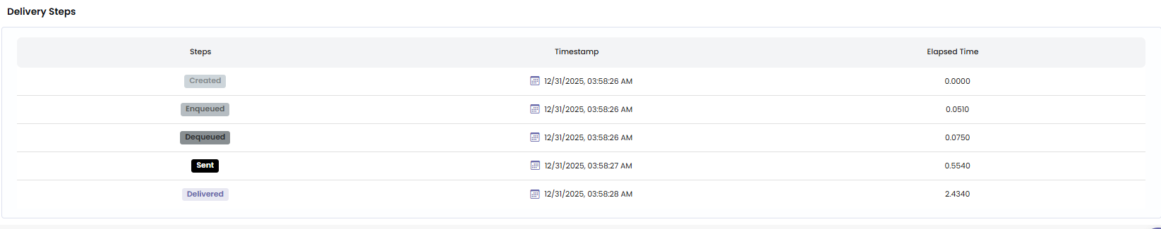 When you open a message inside Message Logs → Details, you’ll see the Delivery Steps panel. This shows the exact journey your message took, timestamped in real-