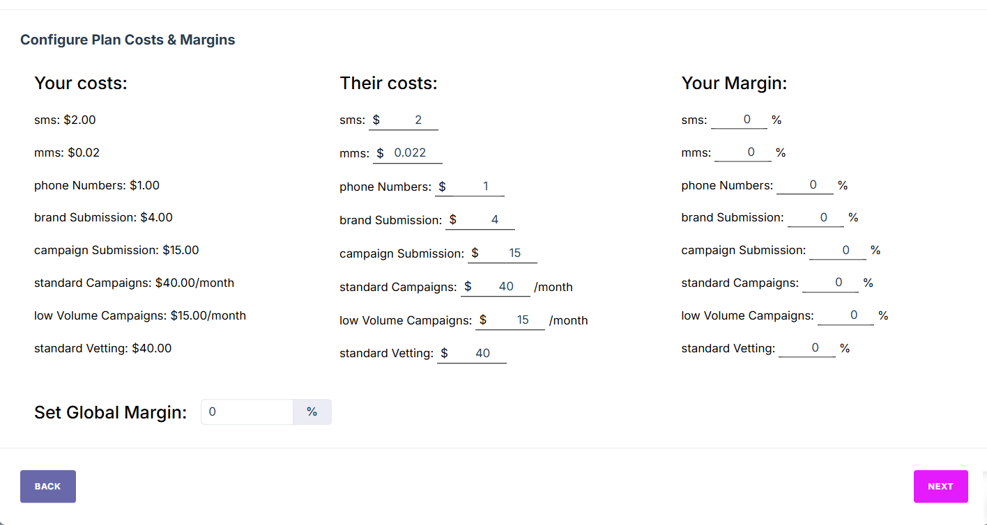 In "Global Margin" you can set the percentage of profit for your business. For instance, if you set margin at 100 percent, all the prices in "Their Costs" will be doubled from "Your Costs." This is how the basic configuration works.
