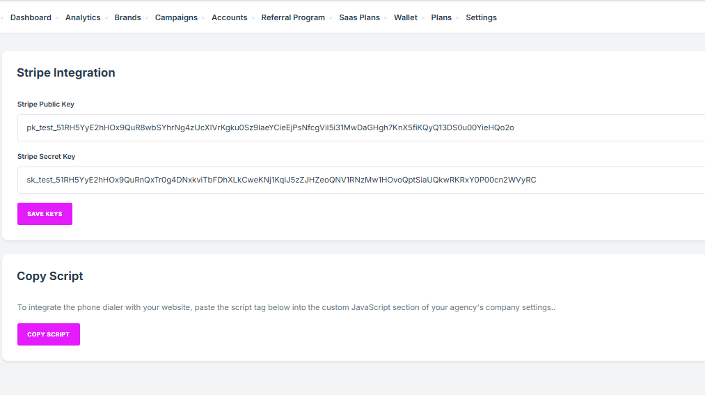 Lastly, to enable rebilling, head to “Settings” on the app dashboard and make sure you integrate your Stripe Key.